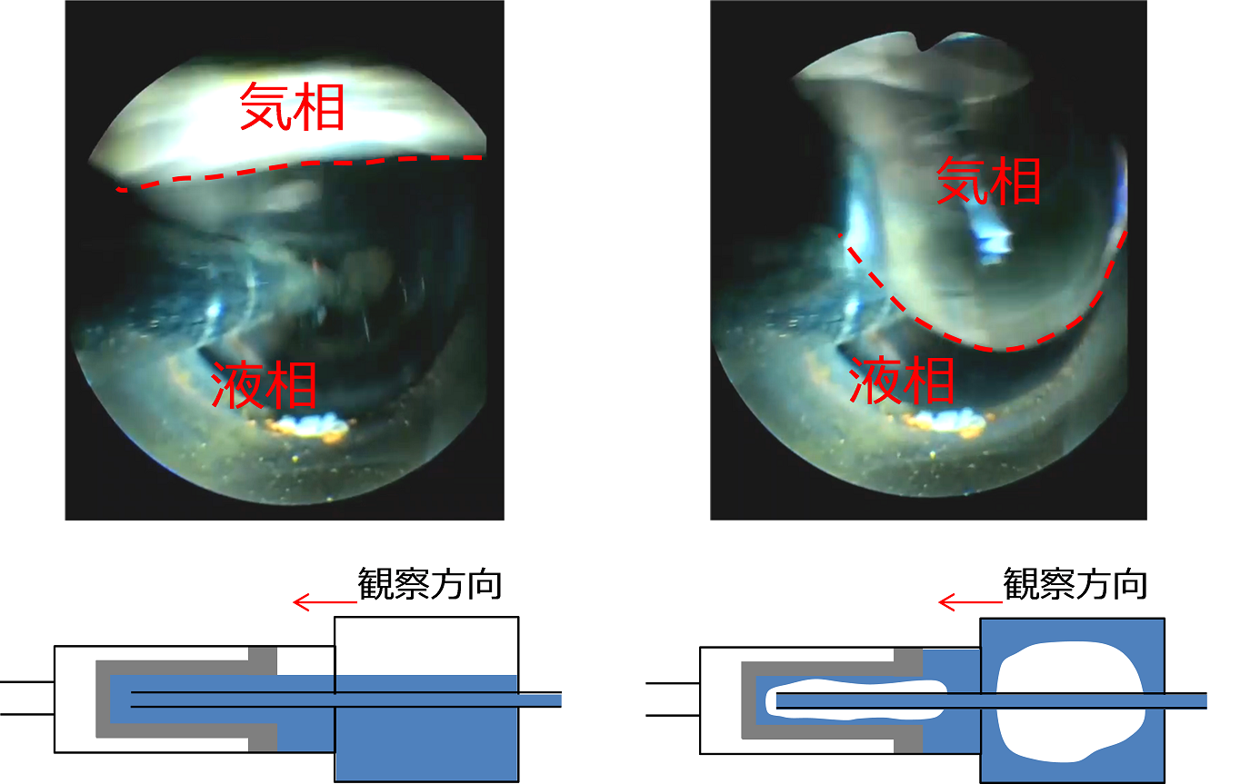 本研究では,工業用内視鏡を用いた蒸発器内の可視化,及びハイスピードカメラを用いた凝縮器内の可視化によりMLHPの熱流動機構解明に取り組んでいる(図2).本研究室ではこれまでに多孔質材料や作動流体,パラボリックフライトによる微小重力環境など,様々な条件がMLHPの動作に与える影響を調べてきた(図3).現在はMLHP特有の動作である熱共有モード(図1(b))の更なる理解や,凝縮器での凝縮の詳細な検討に取り組んでいる.