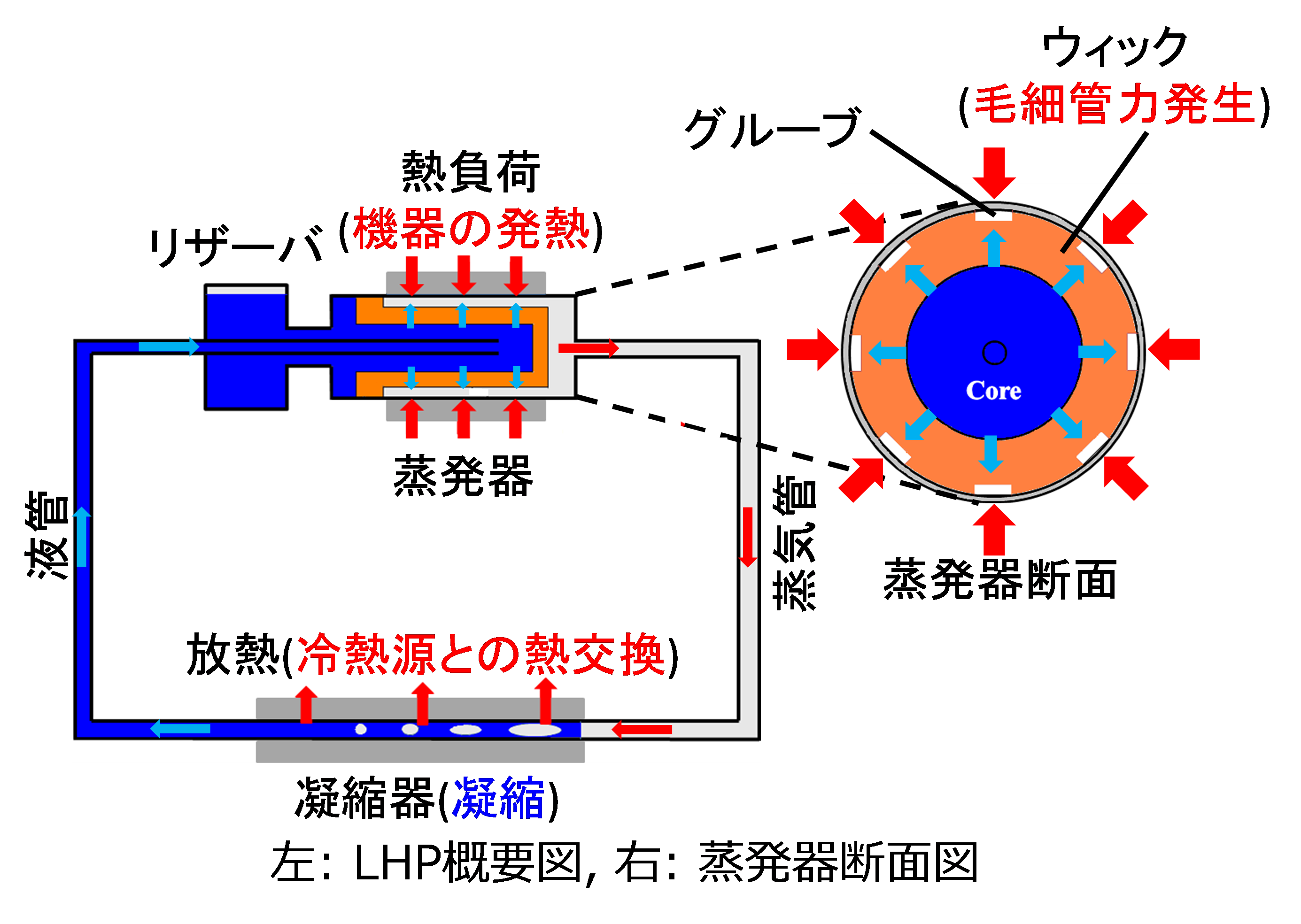 Loop heat pipe(LHP) は,蒸発器内部に挿入された ウィックと呼ばれる多孔体の毛細管力を駆動源として作動流体の一方向ループを生み出し,作動流体の気液相変化を利用することによって蒸発器から凝縮器へと熱輸送するデバイスである. ポンプなど流体を循環させるための電力を一切使用することなく熱輸送が可能である.従って近年の省エネルギー化の必要性の中で,電子機器の冷却や自動車の排熱利用,太陽熱を利用した住宅エネルギーシステムへの適用など,民生分野での実用化が期待されている.またヒートパイプやサーモサイフォン等,LHPと同様に無電力で熱輸送が可能なデバイスは存在するが,LHPは長距離熱輸送性能に優れ,熱源が放熱部よりも上方に位置するトップヒートモードでの熱輸送特性を有するため,LHPは次世代のエネルギーマネジメントの一翼を担う非常に有用なデバイスであると言える.